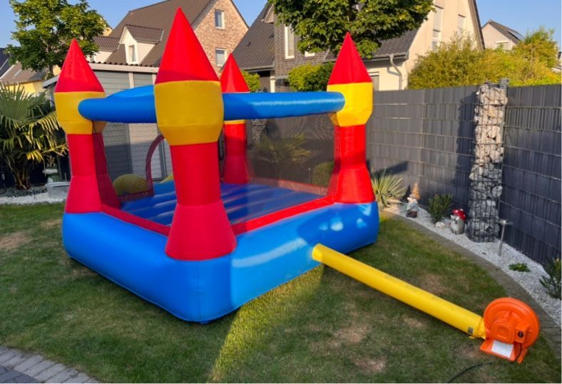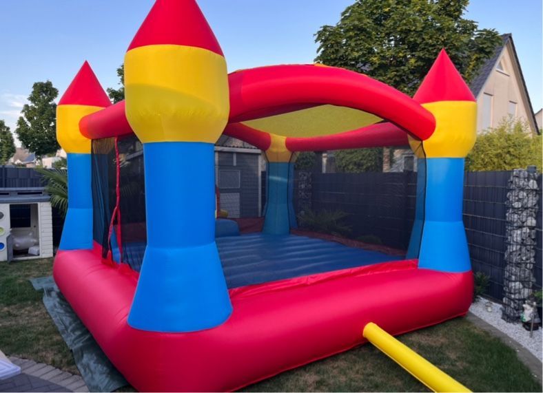 Mit dieser bunten CASTELLO XXL Hüpfburg machen Sie den Garten zum Erlebnispark für Kinder. Eine aufblasbare Hüpfburg zum Spielen mit Freunden im heimischen Garten, oder als Hit auf einem Kindergeburtstag oder jedem Familienfest. Diese Hüpfburg ist nach dem Anschalten des Gebläses in wenigen Minuten spielbereit. Die große Rutsche und die große Hüpffläche sind ein zusätzlicher Spaß für Kinder.Für optimale Sicherheit ist die Hüpfburg rundum mit einem Sicherheitsnetz bespannt. Über eine große Rutsche kann ins Freie gerutscht werden. Ein abnehmbares Dach hält die Sonnenstrahlen von den Kindern ab.
